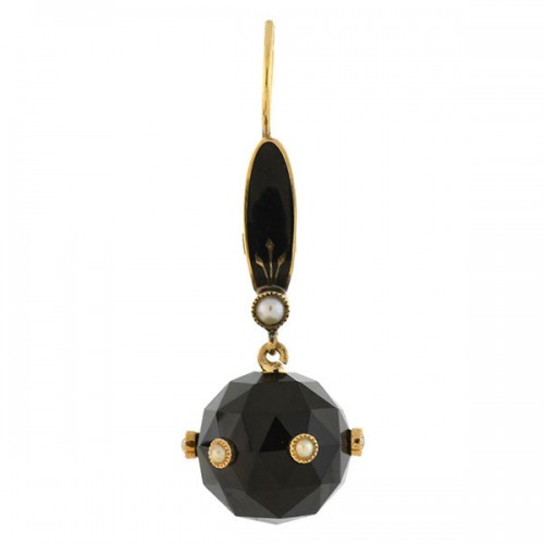 Victorian 14kt Faceted Onyx Sphere + Pearl Enameled Earrings