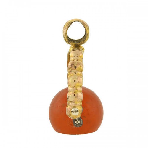 Condition: The overall condition of the piece is excellent. There is some light surface wear to the gold and steel frame, including a small pinhole puncture at the side of the handle, which is not noticeable when worn. The carnelian stone has light surface wear, but no significant chips or scratches. It remains securely riveted in place. A natural patina gives a darkened appearance to the setting, which is a normal characteristic of antique jewelry.