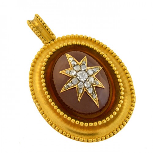 Victorian 15kt Garnet Cabochon Diamond Starburst Locket Pendant