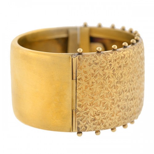 A fantastic gold bracelet from the Victorian (ca1880) era! This beautiful 15kt yellow gold piece is particularly wide and has a fine etched floral design across the front surface. The flowing feminine design includes a garden of ivy leaves which rest atop a textured background and the top and bottom of the front surface is lined in fine bead work. The bracelet is hinged and clasps on the side. A wonderful piece, the bracelet has a classic Victorian look that would make a great addition to any collection!