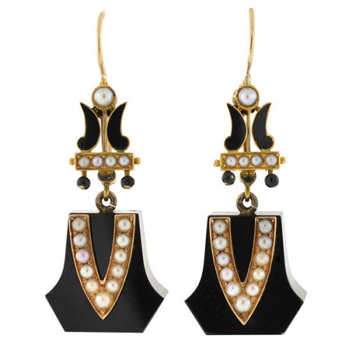 A beautiful pair of Etruscan earrings from the Victorian (ca1880) era! Made of vibrant 15kt yellow gold (indicating English origin), the earrings have an unusual 3-dimensional design complete with fine Etruscan wirework and beadwork. Each earring is formed by two open cups, which have a scalloped edge and are set back-to-back. Hugging the middle of the design is a strand of thin twisted gold rope that wraps around twice and a single Etruscan bead rests in the center of each open cup with a third bead dangling from below. The earrings hang from simple clasped earring wires and rest just below the ear when worn. Delicate and beautiful, they display wonderful artistry and would make a one-of-a-kind addition to any collection!