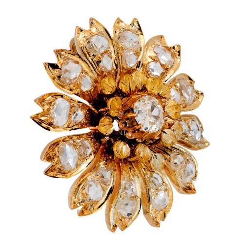 A lovely diamond flower pendant from the Victorian (ca1880s) era! Crafted in vibrant 18k yellow gold, this floral-motif shaped pendant is encrusted with diamonds. The center of the pendant features a central mine cut cushion cut diamond held within an eight-prong setting. The pendant also features 12 petals, which are decorated with bead-set rose cut diamonds. Overall, the diamonds have an approximate total carat weight of 1.60ctw. The back of the pendant features a hidden bail, perfect for attaching the piece to a dainty gold chain. A delicate and feminine pendant, this piece would make a gorgeous addition to any Victorian-era jewelry collection!