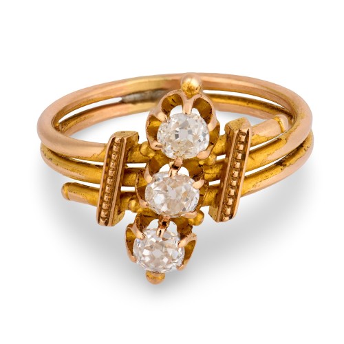 A fabulous diamond ring from the Victorian (ca1880s) era! Crafted in 18k yellow gold, this ring features 3 diamonds running vertically, resulting in the formation of a slightly slanted navette-style centerpiece. The 3 diamonds are all old mine cuts, and are each held within a six-prong setting. Together, the diamonds have an approximate total carat weight of .50ctw, and display G/H color and VS1-SI1 clarity. The shoulders of the ring each feature a vertical post, which are both decorated with small three-dimensional gold balls. The remainder of the band is represented by 3, distinct gold bands, which taper off into 2 bands as the ring progresses. The bands are fused together, which allows for a comfortable fit. A phenomenal example of Victorian-era craftsmanship, this ring would make a striking addition to any collection!