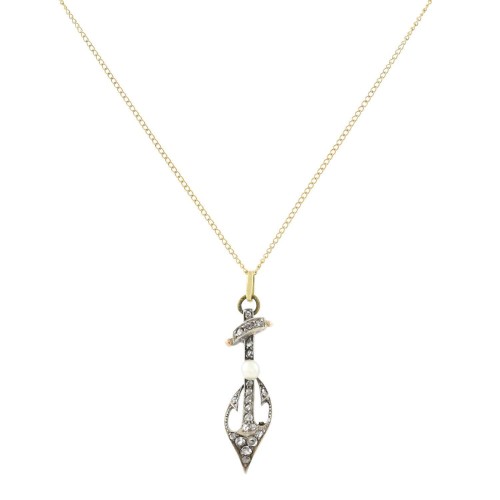 Condition: There is evidence of repair by the clasp and a belcher setting was reinforced. The repairs are minor and not visible when the necklace is worn. All of the diamonds are intact and securely set. The enamel is intact and in good condition. The push clasp and the safety chain’s spring ring are secure and in good working condition.