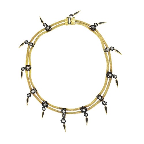 A breathtaking choker necklace from the Victorian (ca1880s) era! Crafted in 18kt yellow gold, the necklace has a lovely double-strand woven mesh design. Patinaed sterling-topped and enameled belcher settings hold approximately 1.50ctw of sparkling Old Mine Cut diamonds. The riveted settings create a lovely pattern of larger enameled stars alternating with smaller stars resting atop golden rectangles enhanced by enameled frames. Enameled darts dangle below with lovely motion, highlighting how the necklace graces the wearer’s collarbone. The necklace closes with a push clasp with an oval hallmark and an additional chain for security. This stunning necklace would make a phenomenal addition to any collection!