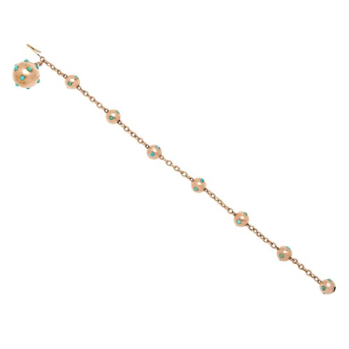 This unusual bracelet is quite a stylish piece from the Victorian (ca1880) era! The 9k rosy yellow gold setting features a series of ball links that alternate with sections of chain links, forming a flexible wrap-around strand. Each ball link is speckled with small turquoise cabochons that vary from robin’s egg blue to teal blue/green. The bracelet fastens with a hidden push clasp within one of the turquoise adorned balls. The tongue of the push clasp is marked “9ct” for gold purity. The final ball link is the largest, which dangles as a charm hanging at the side of the wrist when worn. A wearable piece, it would make a fun and unique addition to any jewelry collection!