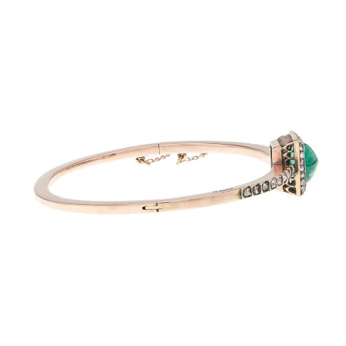 A spectacular emerald and diamond bracelet from the Victorian era (ca1860s)! Made of rosy 14k yellow gold, this Austro-Hungarian made bracelet is a hinged bangle style with a stunning gemstone-encrusted centerpiece. Resting at the center is a magnificent prong-set cabochon emerald with a luscious green color and fabulous garden of inclusions, estimated to weigh approximately 3ctw. The emerald sits in an elevated box style setting, with a petite rose cut diamond resting at each corner where the prongs are situated. A frame of rose cut diamonds surrounds the emerald cabochon, offering additional sparkle to the piece. Crawling down either shoulder of the front of the bracelet is a row of 9 rose cut diamonds, 18 total. We estimate there to be approximately 0.35ctw of rose cut diamonds total in the bracelet. The bracelet is hinged, making it ease to put on and take off. The design of the bracelet is complete with a simple hidden push clasp which is also fitted with a safety chain for extra security. You will notice a series of three hallmarks on the side of the piece, including the maker’s initials, “HG” in a rectangular frame, a wolf’s head with the letters PF in a diamond frame signaling Austro-Hungarian origin, circa the late 1860s as well as a letter date mark. A gorgeous and very well made piece, it would make an impressive addition to any collection!