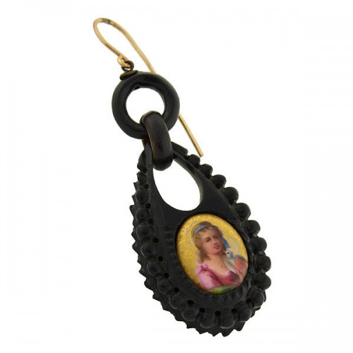 An impressive pair of jet earrings from the Victorian (ca1880) era! These unusual earrings are quite substantial in size, and bear an artistic hand-crafted design. Each earring dangles a large teardrop link at the base, which hangs from a jet ring at teh top. The hand carved detail includes a heavily textured border, adding further dimension to the design. Painted on the surface of each link is a wonderful portrait of a young girl. The color and detail of the image is incredibly fine, including blue ribbon tied around a head of blonde ringlets, soft facial features, and a charming pink dress. The girl rests above a metallic gold background, and holds a sweet bird in her arms that resembles a dove. A gold earring wire is attached to the top of each earring, completing the striking design. Despite their size, the earrings are quite lightweight and comfortable to wear. A wonderful example of artisan Victorian jewelry, these earrings would make a striking addition to any antique collection!
