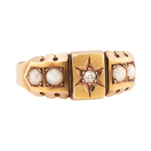 A lovely diamond and pearl ring from the Victorian (ca1880s) era! Crafted in vibrant 15k yellow gold, this ring features a small central old European diamond held within a bead setting. The diamond is further bordered by a unique carved motif, which resembles a blooming flower. Each shoulder of the ring features two small seed pearls, which are also bead set. The remainder of the band is smooth and simple, and the inside of the shank is stamped with a variety of English hallmarks which include: a small shield motif, “15” and “625” purity marks, and with the letter “K”. The inside of the shank, near the front of the ring, is also stamped “15-62”. A dainty and delicate band, this ring would make a lovely addition to any Victorian-era jewelry collection!