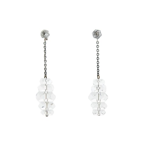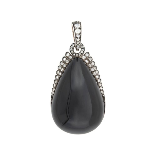 Measurements: The pendant measures approximately 2 1/2″ in length (including the diamond bail), 1 1/8″ wide, and nearly 3/4″ at its deepest point. The earrings hang 2 1/16″ in length (including the earring wire), 19/32″ wide, and slightly less than 3/8″ deep. The onyx surmounts measure slightly less than 3/8″ in diameter and they hang almost 1/2″ in length when worn alone.