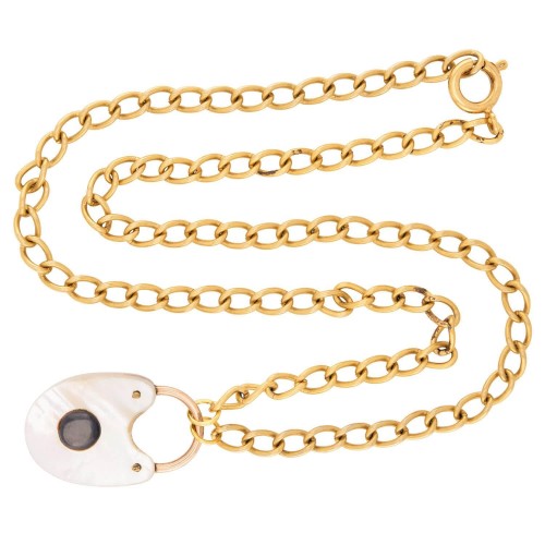 A beautiful pendant necklace from the Victorian (ca1880s) era! This piece begins with a gold-filled cable chain, which secures with a large spring ring clasp. A craved mother of peal padlock pendant is located in the middle of the chain, and is accented with dainty gold-filled details. The top of the padlock pendant is attached to the chain, and therefore is not able to move freely along the chain. The wonderful luster of the mother of pearl wonderfully contrasts the yellow gold chain. A unique piece, this pendant necklace would be a romantic gift for any loved one!