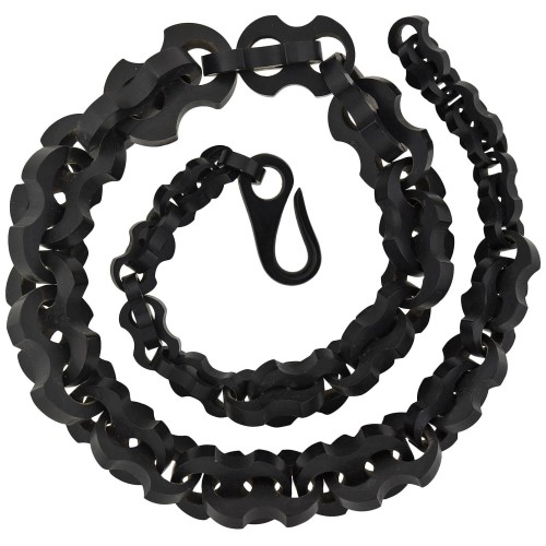 This incredible necklace from the Victorian (ca1880) era is a fabulous example of jewelry crafted from Gutta-percha! This bold and beautiful piece is comprised of unique hand carved links that graduate slightly in size. Each link is reminiscent of an anchor or mariner style link, however these links feature a wonderful scalloped edge. The rich black gutta-percha creates a bold and eye-catching appeal and the length of the necklace allows it to beautifully rest below the neckline. Finishing the design is a hand carved hook that securely fastens to the last open link. A unique and dramatic piece, it would make a fabulous addition to any collection!