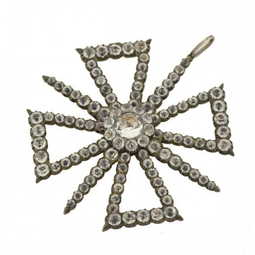 This Maltese cross pendant from the Victorian (ca1880) era is a beautiful example of antique French Paste jewelry! The sterling silver pendant is particularly large in size, forming a Maltese cross with four spears that intersect at the center. French paste stones cover the entire surface of the pendant, lining the cross and spears, and forming a gorgeous raised cluster at the center. The majority of the stones are faced old Mine Cuts, excluding the larger center stone which is an old European cut. All of the stones rest within pinched belcher-style bezels, and have subtle color variation in gold and pinkish hues thanks to their closed foil back settings. A large silver bail is attached to one of the spears, allowing the cross to hang at the side from a favorite chain. An outstanding antique piece, this lovely pendant looks wonderful when worn and would make a marvelous addition to any Victorian collection!