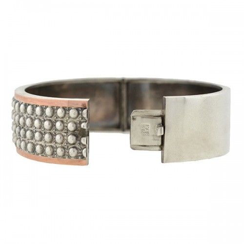 A wonderful mixed metals bracelet from the Victorian era! Made of sterling silver, this stylish piece has a rose gold border on the front that lines the top and bottom edges. The center of the bangle is comprised of a pattern of raised beadwork that is lightly hammered, resembling “cut steel” studs to some extent. Very fine beadwork rests in between each larger stud, adding further depth and texture to the design. The reverse side of the piece is left simple and smooth. The bangle is hinged and opens at a push clasp at the side, which is hallmarked with the maker’s initials “S&S Sta.” When worn, it makes a fashionable statement that could be worn alone or stacked with other complimentary bangles for a layered look. This Victorian era piece makes a fashionable everyday accessory for the modern day woman!