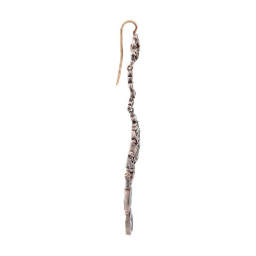 A striking pair of earrings from the Victorian (ca1880s) era! Crafted in sterling silver and 14k gold, these beautifully patinated earrings have an elaborate floral design encrusted with glinting Rose Cut diamonds along with pale blue Aquamarines, which have an approximate total weight of 15.00ctw+. The ornate floral design is comprised of three hinged links featuring swirling leaves and flowers with the diamonds and aquamarines mixed among the lowest link. Three pear cut aquamarines dangle from hinged links attached to the lower link as well. Yellow gold wires secure the pair to the wearer’s ears, and they frame the face beautifully. This magnificent pair would look phenomenal worn at a special event, and they would be an excellent addition to a Victorian collection!
