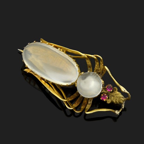 Condition: The pin is in very good antique condition. Besides normal surface wear, there is no apparent damage to the silver gilt setting. The moonstone cabochons and pink sapphire stones are intact and securely set. The larger moonstone has some light surface wear to the underside, which is does not detract from the beauty of the overall piece. The pin clasp fastens securely and is in good working condition.