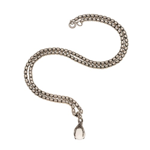 An absolutely stunning pools of light claw pendant necklace from the Victorian (ca1880) era! This incredible piece is comprised of a sterling silver pendant which hangs from a complimentary sterling snake chain. The pendant forms the shape of an ornate claw which is grasping a small pools of light sphere within its talons. A scalloped surface at the top of the pendant depicts a scaly texture, making the claw appear to be very realistic. It’s a gorgeous and rare pendant and the necklace would make a fantastic addition to any collection!